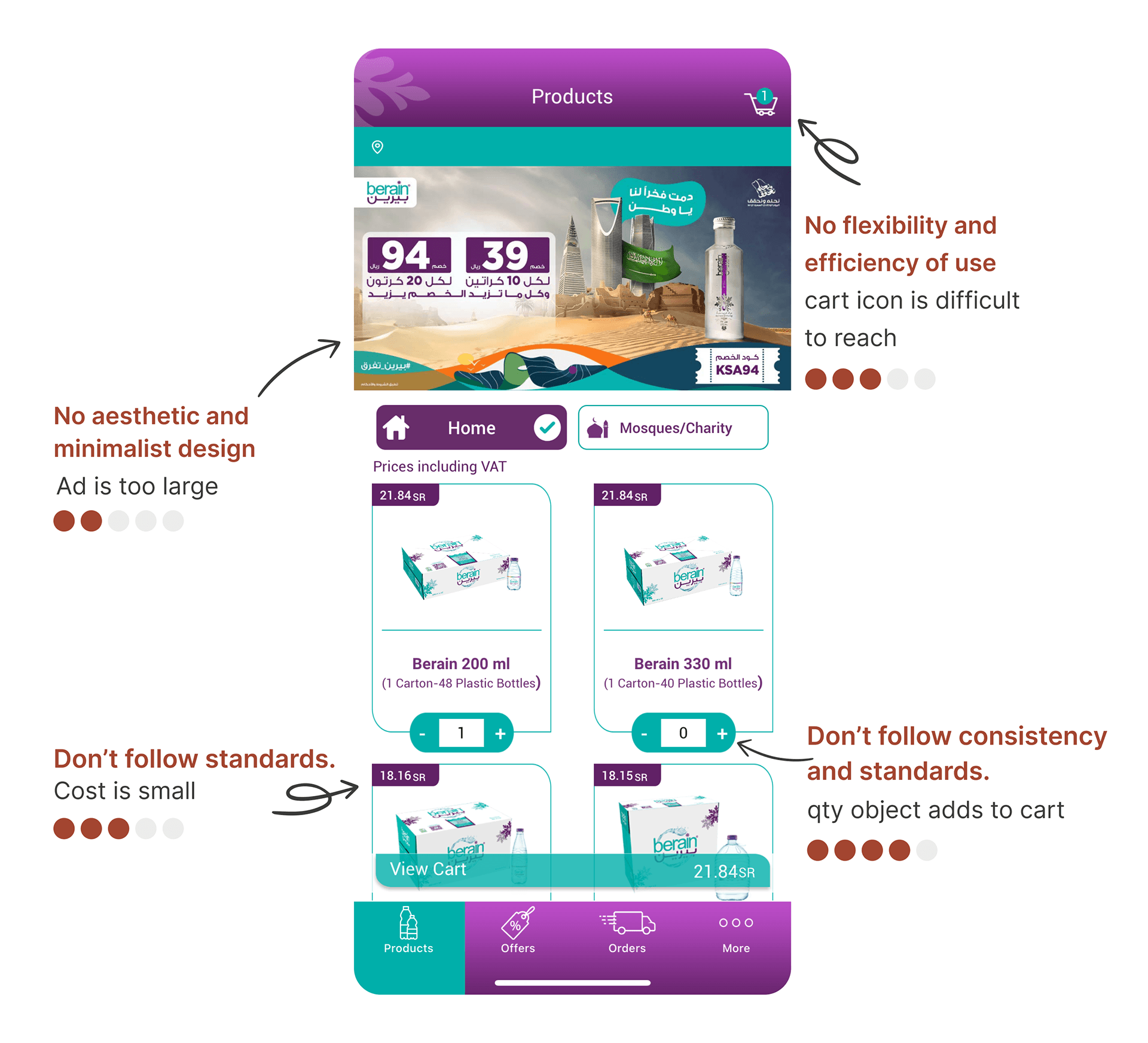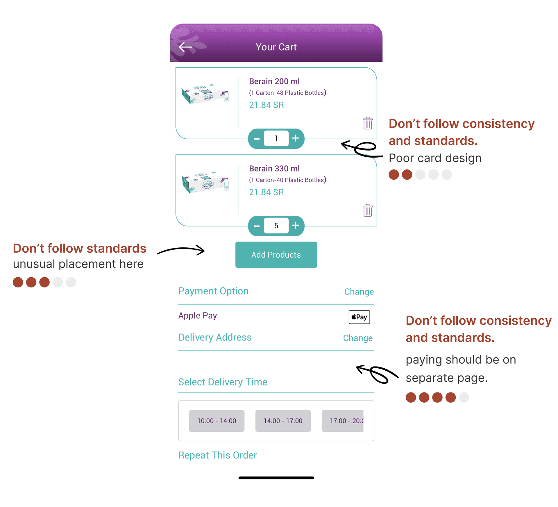 زي ما إنت شايف، في عدة مشاكل في الشاشتين. العناصر الرئيسية مو واضحة أو سهل الوصول لها، وهذا يخلي من الصعب على المستخدم إتمام المهام الأساسية في تطبيق الغرض منه البيع. وهذا يرجع للإبداع المفرط، الغير ضروري، لأنه المستخدم يتوقع أنماط تصميم مألوفة لأي تطبيق تجارة إلكترونية.