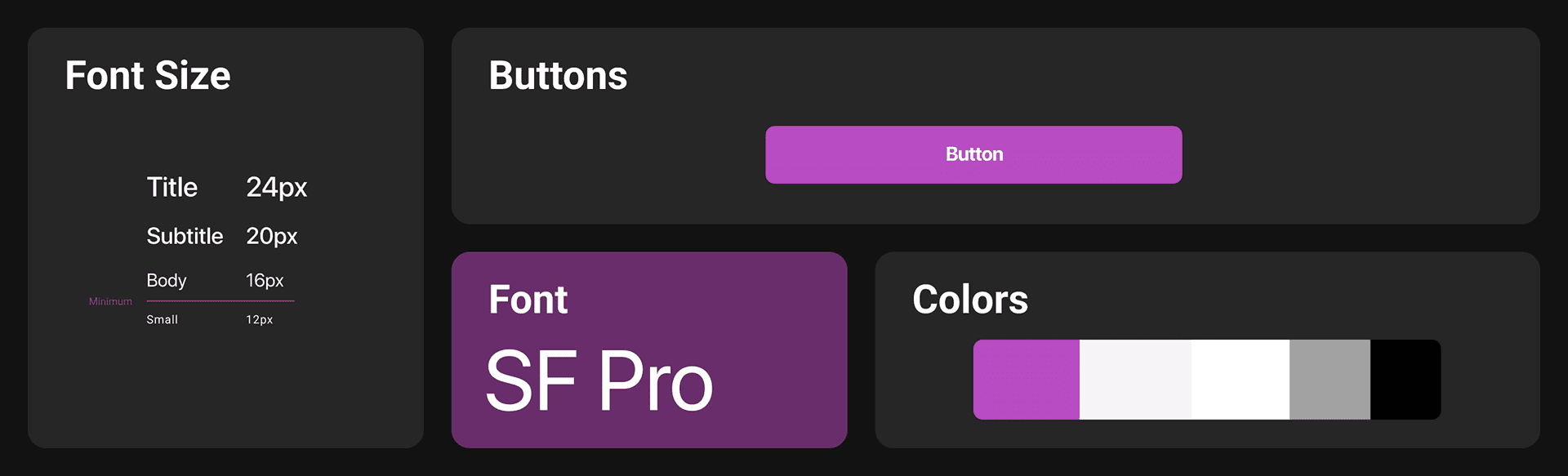 بعد معالجة المشاكل في التصميم الأصلي، قررت تقليل الفوضى في اختيارات الألوان والأزرار وأحجام الخطوط. زي ما إنت شايف في لوحة الأنماط الجديدة، تم تغيير الخط إلى SF Pro لتوفير شعور أكثر حداثة. بالإضافة إلى ذلك، حسّنت التسلسل الهرمي لأحجام الخطوط لتوضيح المعلومات. علاوة على ذلك، وحّدت شكل الأزرار في الشاشتين واخترت اللون الأساسي من الشاشات الأصلية، وهو الوردي، لجذب انتباه المستخدم بسهولة للعناصر الرئيسية.