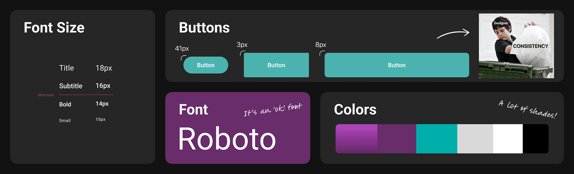 لتحسين الواجهة وتصميم تجربة مستخدم مألوفة، قررت تصميم لوحة أنماط تعالج المشاكل المتعلقة باستخدام الألوان، والخطوط، والتناقضات في عناصر التصميم. هنا لوحات الأنماط قبل وبعد 👇🏼